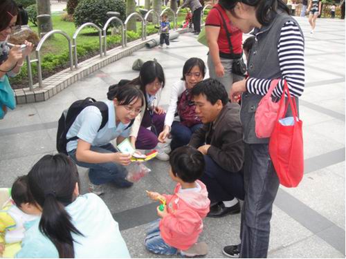 每个小组选择了小孩较多聚集地的小广场进行英教,同学们以气球、糖果、“笑脸”胸针等形式吸引小孩及其家长的注意,让大家都积极地参与其中。