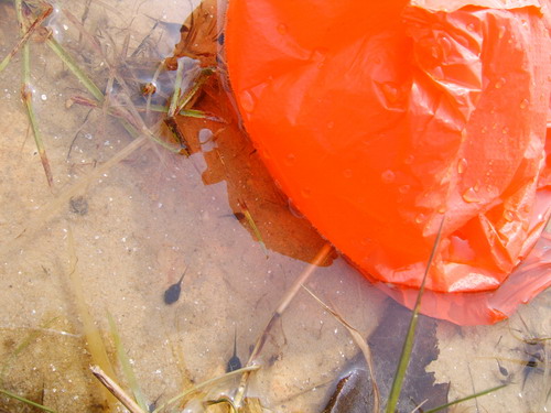 在清理的过程中,我们惊奇地发现在湖边漂浮的红色塑料袋旁竟有小蝌蚪在“畅游”。看到这一幕,同学们哀叹到人类活动对其他生物的生存环境造成的危害是如此之大。