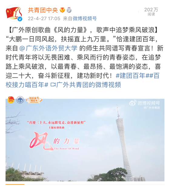 原创歌曲MV《风的力量》献礼党的二十大,并入围团中央建团百年“五四”主题网络直播活动学校共青团作品展播