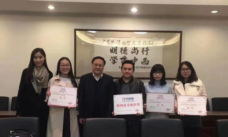 广外共青团以“挑战杯”竞赛为龙头,培育创新创业⼈才。2016年⾄今,学校获“挑战杯”系列竞赛省赛奖项128项,国赛奖项16项,获省赛优秀组织奖、优胜杯11次,国赛优秀组织奖2次,成绩在全省排名前列。在国内高水平竞赛中,我校学⼦屡获佳绩,曾获CGTN俄语总决赛冠军、Model APEC总决赛⼀等奖等,共计获得国家级奖项787项,省级奖项1005项。